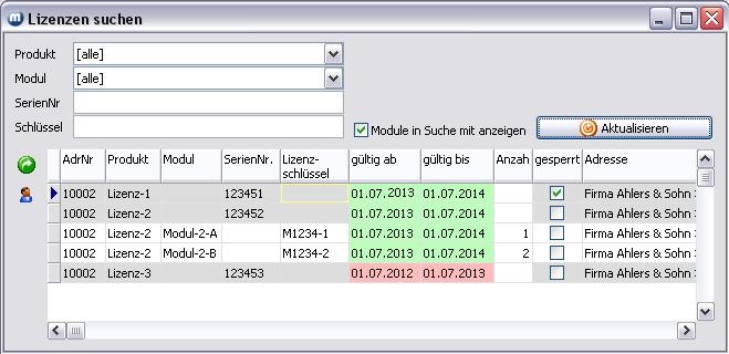 Hier im Beispiel sehen Sie, dass der Gültigkeitszeitraum für die Lizenz-3 der Firma Ahlers & Sohne abgelaufen aber noch nicht gesperrt wurde. Die Lizenz-1 ist noch nicht abgelaufen, wurde aber gesperrt. Die anderen Lizenzen und Module liegen noch im Gültigkeitszeitraum.