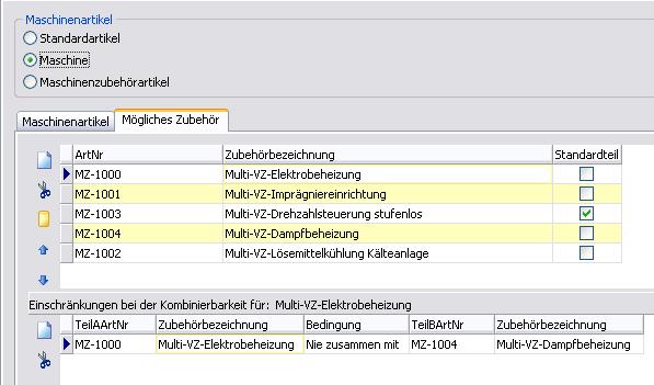 In dem Beispiel wurden einer Maschine fünf Zubehörteile zugeordnet. Der Zubehörartikel MZ-1003 wurde als Standardteil definiert. Eine Einschränkung zur Kombinierbarkeit wurde bei den Artikeln MZ-1000 und MZ-1004 bestimmt, da (hier in diesm Beispiel) die Maschine entweder elektrobeheizt oder dampfbeheizt sein kann.