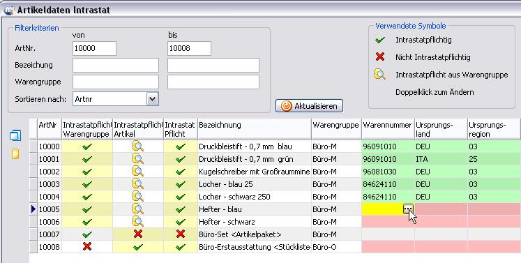 Ein grünes Häkchen in einer Zeile der Spalte IntrastatPflicht bedeutet "Intrastatpflicht" - entweder aus Warengruppe oder aus Zuweisung zum Artikel.