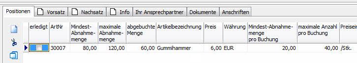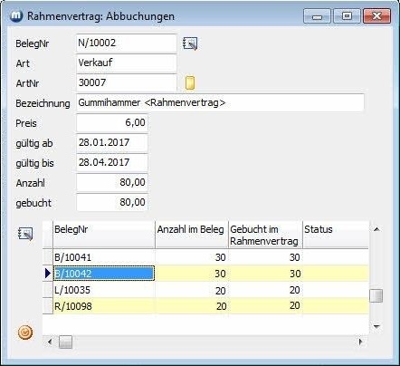 Beispiel - Rahmenvertrag - mit abgebuchter Menge (durch direkte Beleg- und Artikelerfassung bzw. durch Übernahme aus Rahmenvertrag in Auftrag bzw. Einkauf).