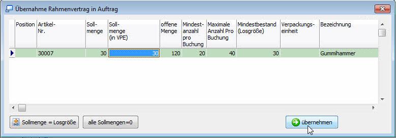 Sie können entweder direkt eine Menge in das Feld Sollmenge eingeben und die RETURN-Taste drücken. Das Feld Sollmenge (in VPE) berechnet sich entsprechend. Sie können auch bestimmen, dass Sollmenge = Losgröße ist, indem Sie auf den gleichnamigen Button klicken. Zur Artikelübernahme klicken sie auf den Button übernehmen. Der Auftrag (bzw. der Einkauf) wird danach automatisch aufgerufen.