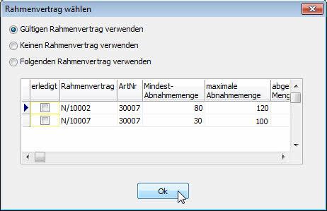 - oder - bei mehreren Rahmenverträgen ein bestimmter Rahmenvertrag genommen werden soll [Folgenden Rahmenvertrag verwenden]. Klicken Sie in der Tabelle auf die Zeile des Rahmenvertrages, um ihn auszuwählen. Hier erfolgt keine Gültigkeitsprüfung bezüglich Datumswerte etc.