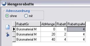 Um sich alle kundenspezifischen Mengenrabatte anzusehen, rufen Sie das Menü Artikel/Rabatte/Mengenrabatte auf. Im Bereich Adresszuordnung klicken Sie auf die Option mit.