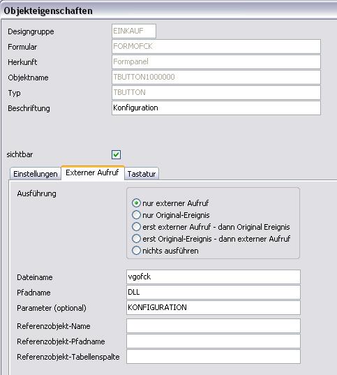 Unter Ausführung wird die Option nur externer Aufruf ausgewählt. Im Feld Dateiname wird der Name der DLL ohne Erweiterung eingetragen, in diesem Fall also VGOFCK. Als Pfadname wird der Eintrag aus den Pfadeinstellungen für den DLL-Pfad in genau der Schreibweise hinterlegt. Unter Parameter wird der eigentliche Funktionsaufruf der DLL definiert. Für den Aufruf der Konfiguration, also KONFIGURATION. Alle anderen Felder bleiben leer.