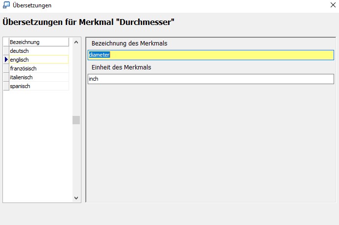 Wählen Sie wieder die benötigte Sprache auf der linken Seite aus und hinterlegen Sie die Übersetzung für das Merkmal und deren Einheit an.