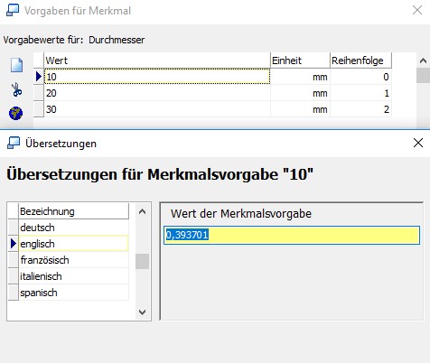 Müssen die für die Merkmalsklasse hinterlegten Vorgabewerte einer Auswahlliste ggfs. für die Anzeige im Shop in eine andere Einheit umgerechnet werden, rufen Sie diese über den Button Vorgaben für Auswahlliste auf. Selektieren Sie einen Eintrag und klicken Sie auf die Weltkugel. Links wählen Sie wieder die benötigte Sprache aus und hinterlegen den umgerechneten Wert z.B. mm in inch. Dieser Wert wird dann im Shop angezeigt.