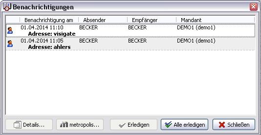 Nachrichten werden ansonsten über das Benachrichtigungssystem dem Empfänger (Absender und der Empfänger können auch identisch sein.) automatisch angezeigt, wenn das Benachrichtigungsdatum bzw. die Uhrzeit erreicht sind.