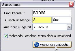 Stellt sich bei der Endkontrolle heraus, dass ein Teil der Produktion Ausschuss ist, so können Sie diesen nach durchgeführter Produktion auf einen Ausschuss-Lagerort buchen. (Voraussetzung: Sie haben einen Ausschuss-Lagerort definiert und der Stückliste im Register Allgemein zugeordnet.)