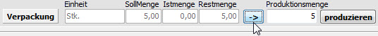 6. Nachdem Sie den Produktionsbeleg mit den eingetragenen Istmengen aus Ihrer Produktionsabteilung zurückerhalten haben, tragen Sie zuerst die Produktionsmenge ein. (wenn SollMenge=Produktionsmenge, dann brauchen Sie nur auf den Pfeil zu klicken - der Wert im Feld SollMenge wird in das Feld Produktionsmenge wird übernommen. Weichen Soll- und Produktionsmenge voneinander ab, tragen Sie die Produktionsmenge direkt in das Feld Produktionsmenge ein.)