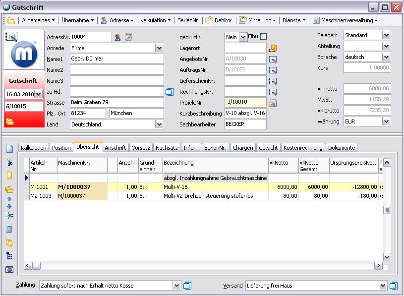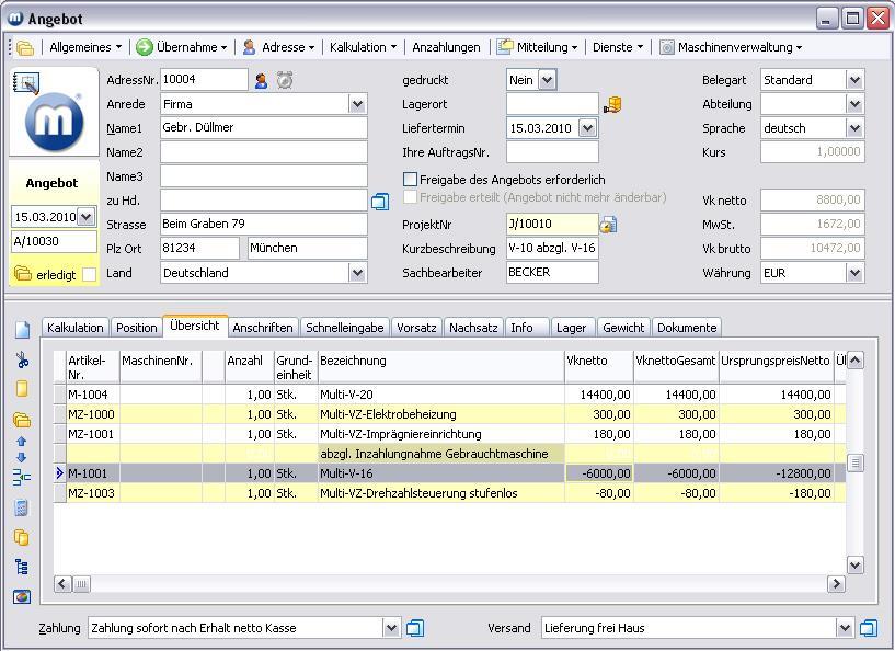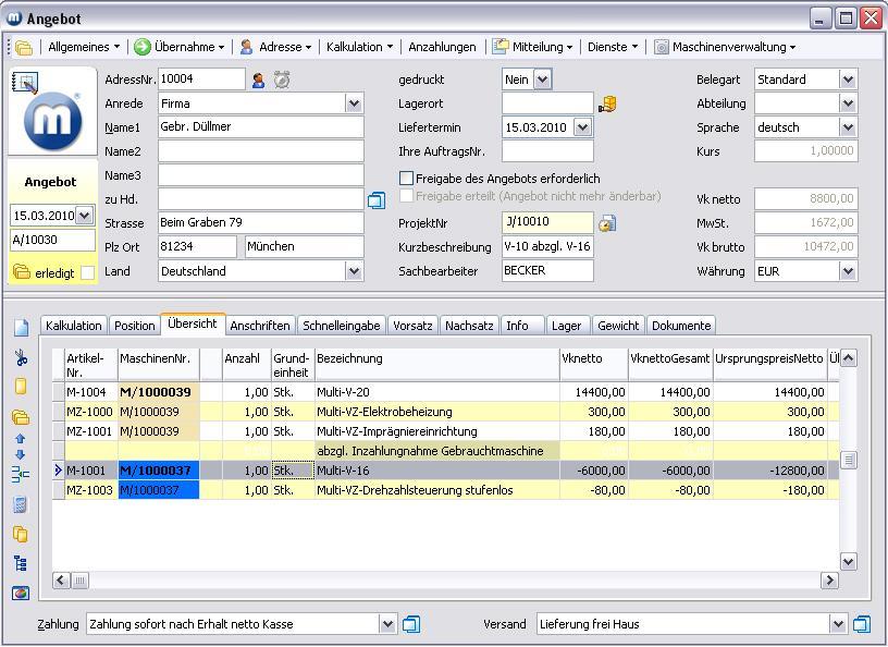 Übernehmen Sie die anzubietende Neumaschine (ggf. auch Preisnachlässe - mit Minuszeichen zu versehen) in den Beleg - wie unter Neumaschine ein- und verkaufen beschrieben.