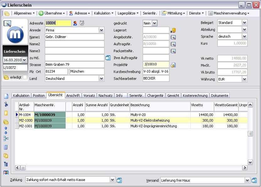Beispiel: Neumaschine, die in einen Lieferschein genommen wurde: