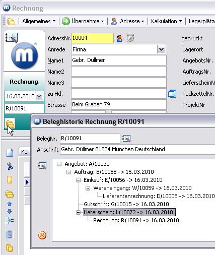 Von jedem Beleg aus können Sie sich die Beleghistorie anzeigen lassen. Klicken Sie in einem Beleg auf den Button Beleghistorie anzeigen.