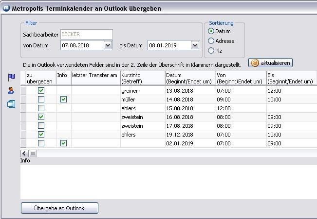 Über das Menü Adressen/Dienste/Übergabe an Outlook/Terminkalender können Termine aus dem metropolis-Terminkalender an den Outlook-Kalender übergeben werden.
