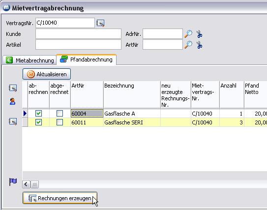 Markieren Sie die Positionen, für die Pfand abgerechnet werden soll mit dem Setzen von Häkchen in der Spalte abrechnen und klicken Sie dann auf den Button Rechnungen erzeugen.