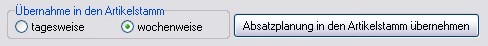 Im Formular Artikel Absatzplanung können Sie bestimmen, ob die Planzahlen tages- oder wochenweise in die Artikelstammdaten übernommen werden sollen. Bei Auswahl der Option wochenweise werden die Daten aus einer Woche zum Anfang der Woche zusammengefasst.