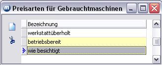 Beim Einfügen einer Gebrauchtmaschine in einen Beleg, werden alle zugeordneten Preisarten/Verkaufspreise angezeigt. Es kann eine der Preisarten mit entsprechendem Verkaufspreis zur Übernahme in den Beleg gewählt werden. Wird das Formular ohne Auswahl geschlossen, wird der reguläre Verkaufspreis der Maschine übernommen.