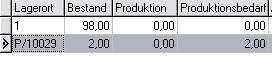 Wenn weder das Kontrollkästchen Produktionslagerort erzeugen (sonst Standardlagerort) noch Umbuchen von Standardlagerort zum Produktionslagerort aktiviert sind, wird nach dem Erzeugen des Einkaufs (Button Einkauf erzeugen im Formular produktionsbezogene Anfrage/Einkauf) für die Stücklisten-Elemente der Produktionsbedarf ausgegeben