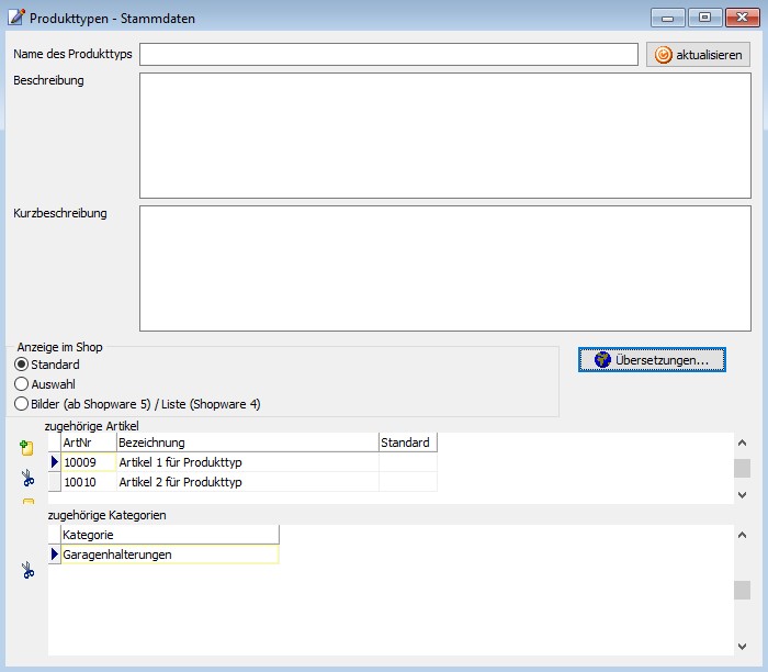 Sollten Sie Produkttypen verwenden, um „gleiche Artikel“ mit z.B. verschiedenen Abmessungen in Shopware als einen Artikel darzustellen, können Sie auch für diesen Übersetzungen hinterlegen. In diesem Fall müssen auch die Merkmalsklassen übersetzt werden. Rufen Sie die Produkttypen über das Menü Dienste/Webshop/Parameter/Produkttypen auf. Klicken Sie in den Details des Produkttyps auf den Button Übersetzungen.