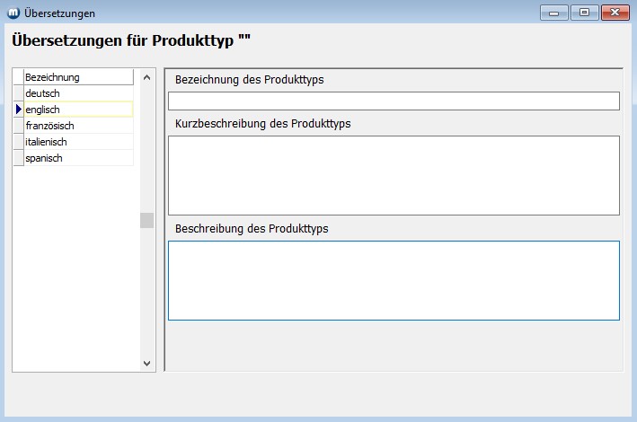 Auf der linken Seite können Sie wieder die benötigte Sprache selektieren und für diese Übersetzung hinterlegen. Für Produkttypen können Sie die Bezeichnung, Kurzbeschreibung und Beschreibung übersetzen.
