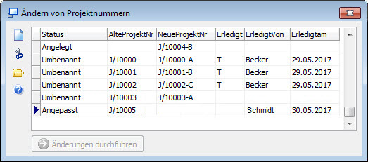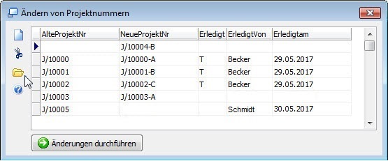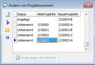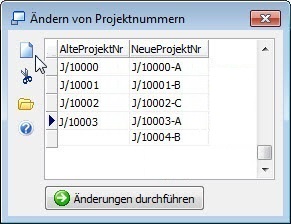 Zum Umbenennen geben Sie in die Spalte AlteProjektNr die zu ändernde Projektnummer ein und in die Spalte NeueProjektNr die neue Nummer ein. (Das Feld ProjektNr ist vom Typ String und max. 18 Stellen lang!)
