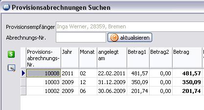 Sie rufen das Menü Provision/Abrechnungen/Suchen auf. Es werden alle Provisionsabrechnungen aller Provisionsempfänger angezeigt. Über den Lupe-Button können Sie durch das Wählen einer Provisionsempfänger-Adresse die Anzeige in der Tabelle einschränken.