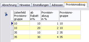 Ist einem Artikel keine Provisionsgruppe zugewiesen worden oder dem Provisionsempfänger keine Provisionsgruppe im Register Provisionsabzug, so wird der Provisionsabzug verwendet, der unter dem Menü Provision/Parameter/Provisionsabzug bei Rabatt eingestellt worden ist.