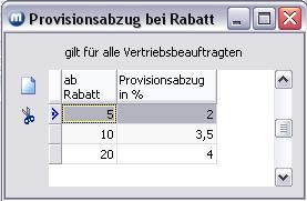 - Anlegen einer Tabelle für den Rabattabzug unter dem Menü Provision/Parameter/Provisionsabzug bei Rabatt.