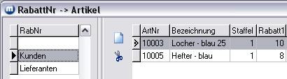 Rufen Sie das Menü Artikel/Rabatte/Rabattnummern/Artikel auf. Wenn Sie die RabattNrn zuvor festgelegt haben, werden Ihnen diese in der linken Tabelle angezeigt. Klicken Sie auf die RabattNr und ordnen Sie dieser die gewünschten Artikel zu. Tragen Sie zu den Artikel die Staffeln und Rabatte ein.