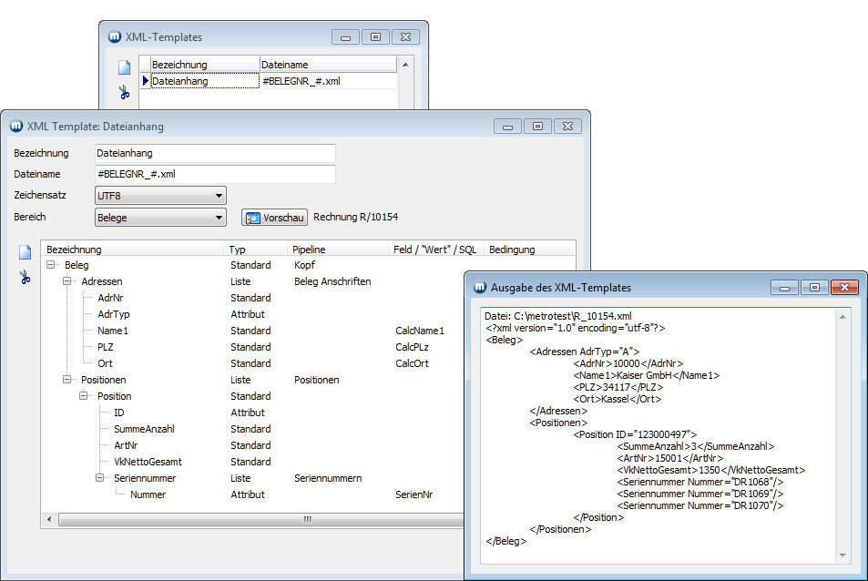 Es ist möglich, beim E-Mail-Belegversand XML-Templates mit Belegdaten (Felder aus Belegkopf, Belegpositionen, abweichenden Anschriften und Seriennummernzuweisungen) anzuhängen.