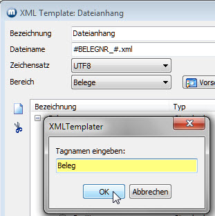 2. Klicken Sie doppelt auf die neue Zeile, erhalten Sie das Formular XML Template <Bezeichnung>. Hier können Sie den Zeichensatz (UTF8 oder Windows-1252) und den Bereich (zurzeit nur Belege) wählen. Dann werden die XML-Daten eingetragen, ausgewählt und zugeordnet. Klicken Sie in dem Formular auf den Neueingabe-Button, öffnet sich das Formular XMLTemplater.