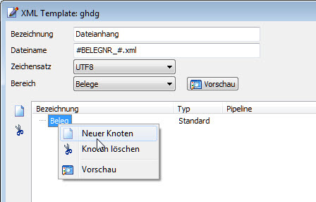 Soll ein untergeordnetes Element eingefügt werden, wird die Markierung auf das übergeordnete Element gesetzt und mit der rechten Maustaste geklickt. Es öffnet sich ein Kontextmenü, über das wieder neue Tags (Kontextmenü Neuer Knoten öffnet wieder das Formualr XMLTemplater) gesetzt oder vorhandene gelöscht werden können.