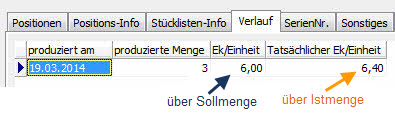 Hier im Beispiel wich der tatsächliche Verbrauch (Menge: 3,2) von dem Sollverbrauch (Menge 3,00) ab. Bei dem EK von 6,00 Euro/Einheit ergibt sich für den tatsächlichen EK ein Preis von 6,40 Euro/Einheit (3,2 * 6,00 Euro = 19,20 / 3).