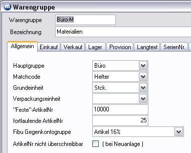 fortlaufende ArtikelNr.: Hier geben Sie eine Anfangsartikelnummer ein, z. B. „25“.. In Verbindung mit der „Festen“ ArtikelNr. wird hieraus die Artikelnummer des ersten Artikels, den Sie in dieser Warengruppe anlegen, gebildet. In diesem Beispiel würde der erste Artikel die Nummer „10025“ erhalten. Der nächste Artikel in der Warengruppe automatisch die „10026“ usw.