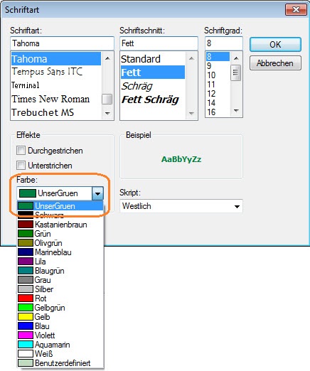 Beispiel - Auswahl der Schriftart und der eigenen benutzerdefinierten Farbe: