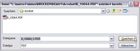 Beispiel: Die Datei B_10064.PDF wurde bereits einmal gedruckt (gespeichert). Bei einer erneuten Speicherung wird der Dateiname B_10064_1.PDF vorgeschlagen. Er kann geändert werden.