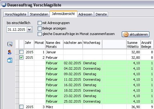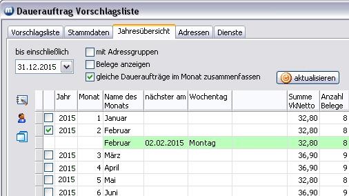 Aktivieren Sie in einer Monatszeile der Tabelle das Kontrollkästchen der ersten Spalte, werden Ihnen alle Daueraufträge des entsprechenden Monats angezeigt.