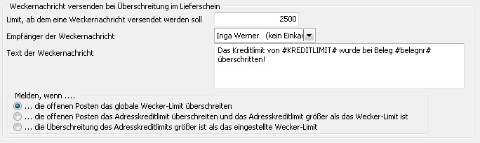 Es besteht die Möglichkeit bei Überschreitung eines eingestellten Limits eine automatische Weckernachricht an den unter Empfänger der Nachricht eingestellten Benutzer zu schicken. Es kann nur ein Benutzer für dem Empfang ausgewählt werden und eine Nachricht wird nur erzeugt, wenn der Vorgang im Lieferschein fortgesetzt wird. Bei einem Abbruch wird keine Nachricht generiert!