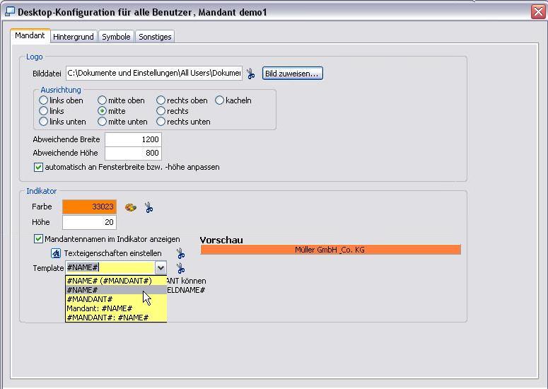 4. Über das Listenfeld Template können Sie auswählen, wie der Mandantenname angezeigt werden soll. Dabei entspricht #MANDANT# dem Eintrag aus Mandant und #NAME# dem Eintrag aus Bezeichnung (Serviceprogramm - Menü Verwaltung/Mandanten, Button Details.