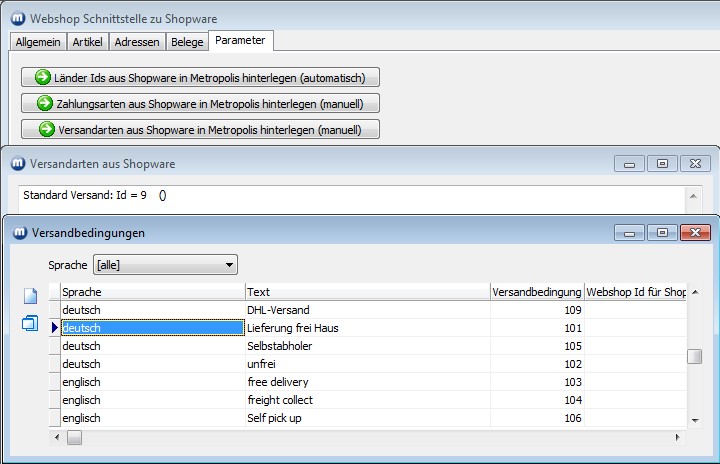 Die Versandarten können über den Button Versandarten aus Shopware in metropolis hinterlegen (manuell) verknüpft werden. Sie erhalten eine Anzeige der in Shopware vorhandenen Versandarten und deren IDs. Tragen Sie die ID aus Shopware in die passende Versandbedingung in metropolis (Menü Adressen/Parameter/Versandbedingungen) in die Spalte Webshop Id für Shopware ein .