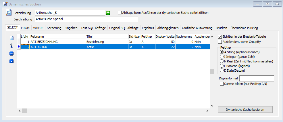 Hier im Beispiel die Artikeldatei mit Artikelbezeichnung (ART.BEZEICHNUNG) und Artikelnummer (ART.ARTNR).