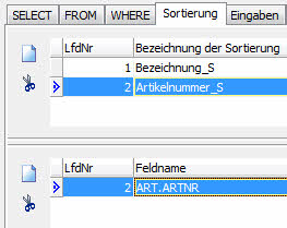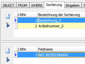 Im Register Ergebnis wird nur die erste gefundene Sortierung verwendet. Die Auswahl in Form eines Listenfeldes (hier im Beispiel Bezeichnung oder Artikelnummer) wird nur im Formular Dynamischen Suche: <"Bezeichnung"><"Beschreibung"> zur Verfügung gestellt. (Klick auf Button