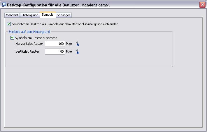 Die Symbole können auch (außerhalb der Desktop-Konfiguration) über das Kontextmenü Symbole/... (Klicken mit rechter Maustaste direkt auf der Benutzeroberfläche) ausgerichtet, angeordnet bzw. nach Name oder Typ sortiert werden. Dieses ist jedoch nur möglich, wenn das Kontrollkästchen persönlichen Desktop als Symbole auf dem Metropolishintergrund einblenden aktiviert ist.