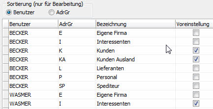 In der Tabelle können Sie je Benutzer auswählen, welche Adressgruppen bei der Adress-Suche (Stammdaten und Belege) als Vorauswahl angezeigt werden sollen. Die Sortierung dieser Tabelle kann (je nach gewünschter Reihenfolge) nach Benutzernamen oder nach Adressgruppe erfolgen.