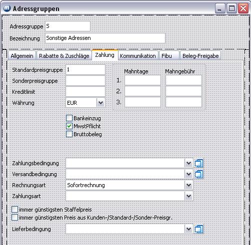 Beispiel: Sie haben in dem Formular Adressgruppen die Bereiche Mahntage/Mangebühr und die Kontrollkästchen Bankeinzug, MwstPlicht und Bruttobeleg verschoben. (D.h. vorher befanden sich die Mahntage/Mahngebühr an der Position, wo nun Bankeinzug, MwStPflicht und Bruttobeleg stehen. Die Reihenfolge der Ansteuerung der Felder ist jedoch noch die "alte".