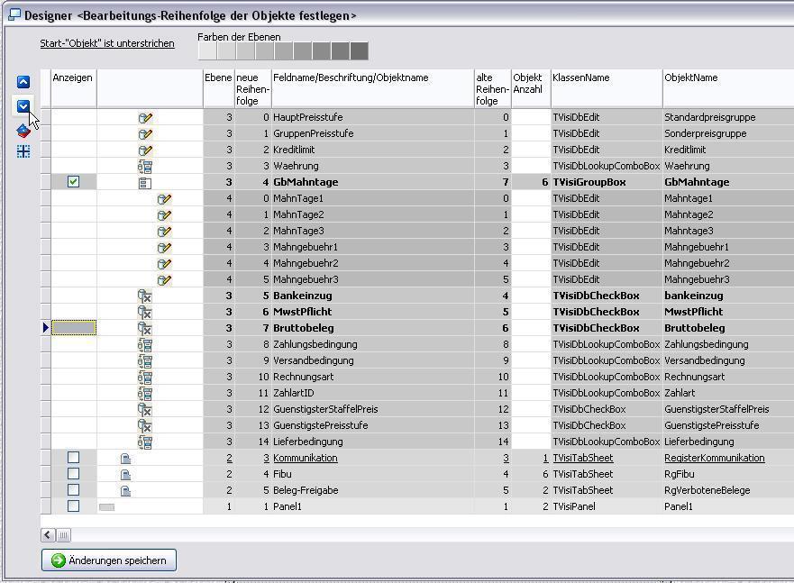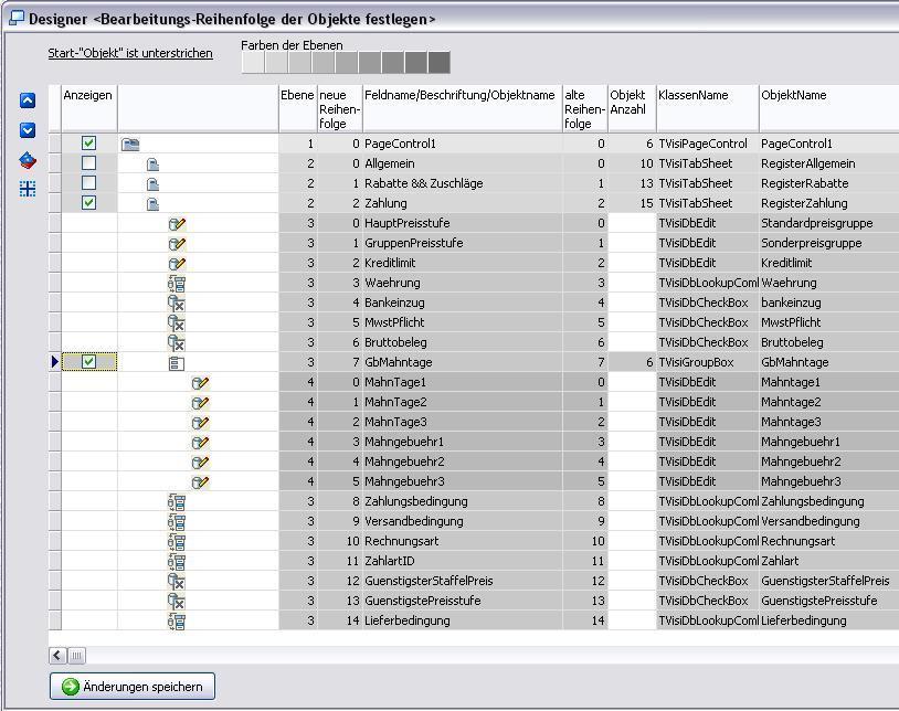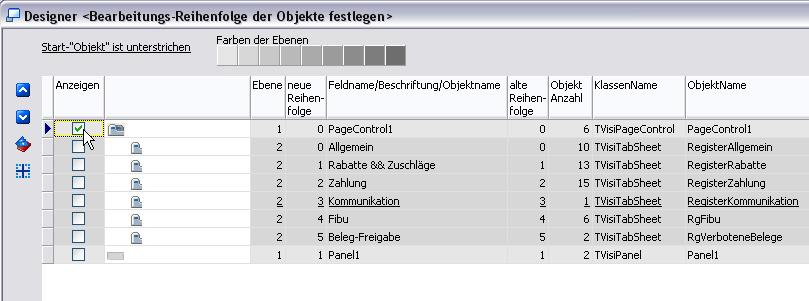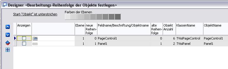 Um die Reihenfolge zu ändern rufen Sie den Designer auf und dort das Menü Bearbeiten/Bearbeitungs-Reihenfolge. Es öffnet sich das Formular Designer <Bearbeitungs-Reihenfolge der Objekte festlegen>.