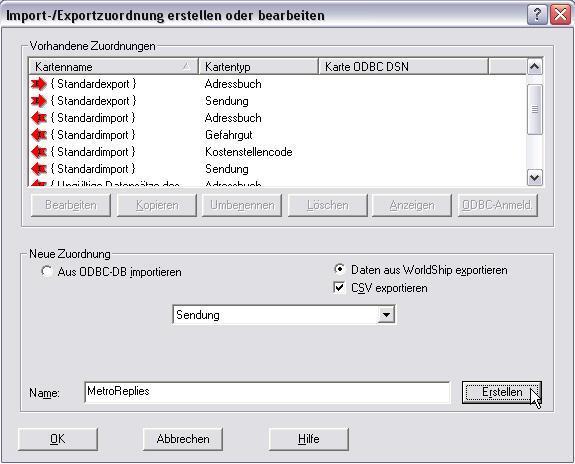 Im sich nun öffnenden Formular wählen Sie im Bereich Neue Zuordnung die Option Daten aus WorldShip exportieren, und aktivieren Sie das Kontrollkästchen CSV exportieren.