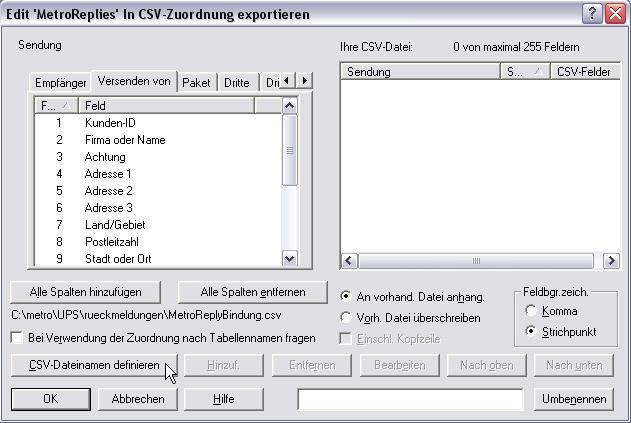 Im sich nun öffnenden Formular Edit "..." in CSV-Zuordnung exportieren klicken Sie auf den Button CSV-Dateinamen definieren.