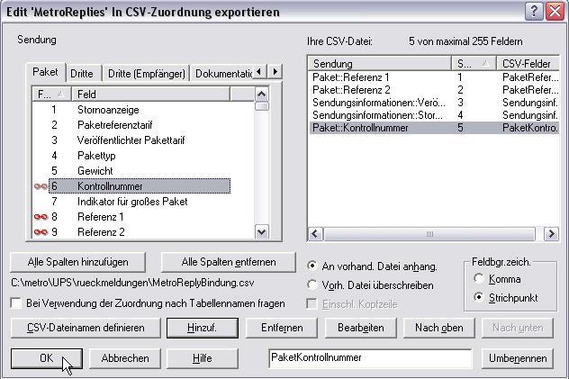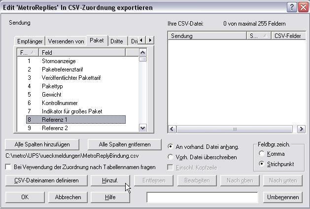 Es ist weiterhin das Formular Edit "..." in CSV-Zuordnung exportieren geöffnet. Hier müssen nun noch weitere Einstellungen vorgenommen werden.