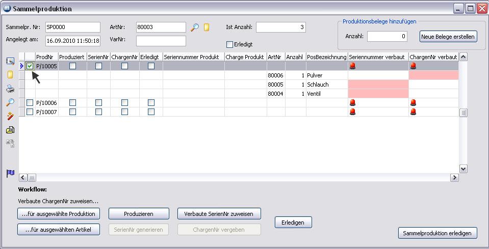 3. Um die Produktionsbeleg-Positionen anzuzeigen, klicken Sie in die erste Spalte einer Zeile (Häkchen wird gesetzt - hier bei ProdNr. P/10005). Jetzt können Sie sehen, welche Angaben (Seriennummer-/Chargenvergabe) noch nicht durchgeführt wurden. Die entsprechenden Zeilen der Spalte werden auf roten Hintergrund dargestellt.