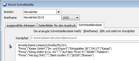 6. Um die Daten, die Ihnen jetzt im Register ausgewählte Adressen angezeigt werden, in die Schnittstellendatei zu übertragen, klicken Sie auf den Button Schnittstellendatei für Word© erzeugen. Es wird eine Datei (mit dem Namen, den Sie unter Briefname eingegeben haben) mit der Endung .SER erzeugt. Die Daten der Schnittstellendatei sehen Sie im Register Schnittstellendatei.